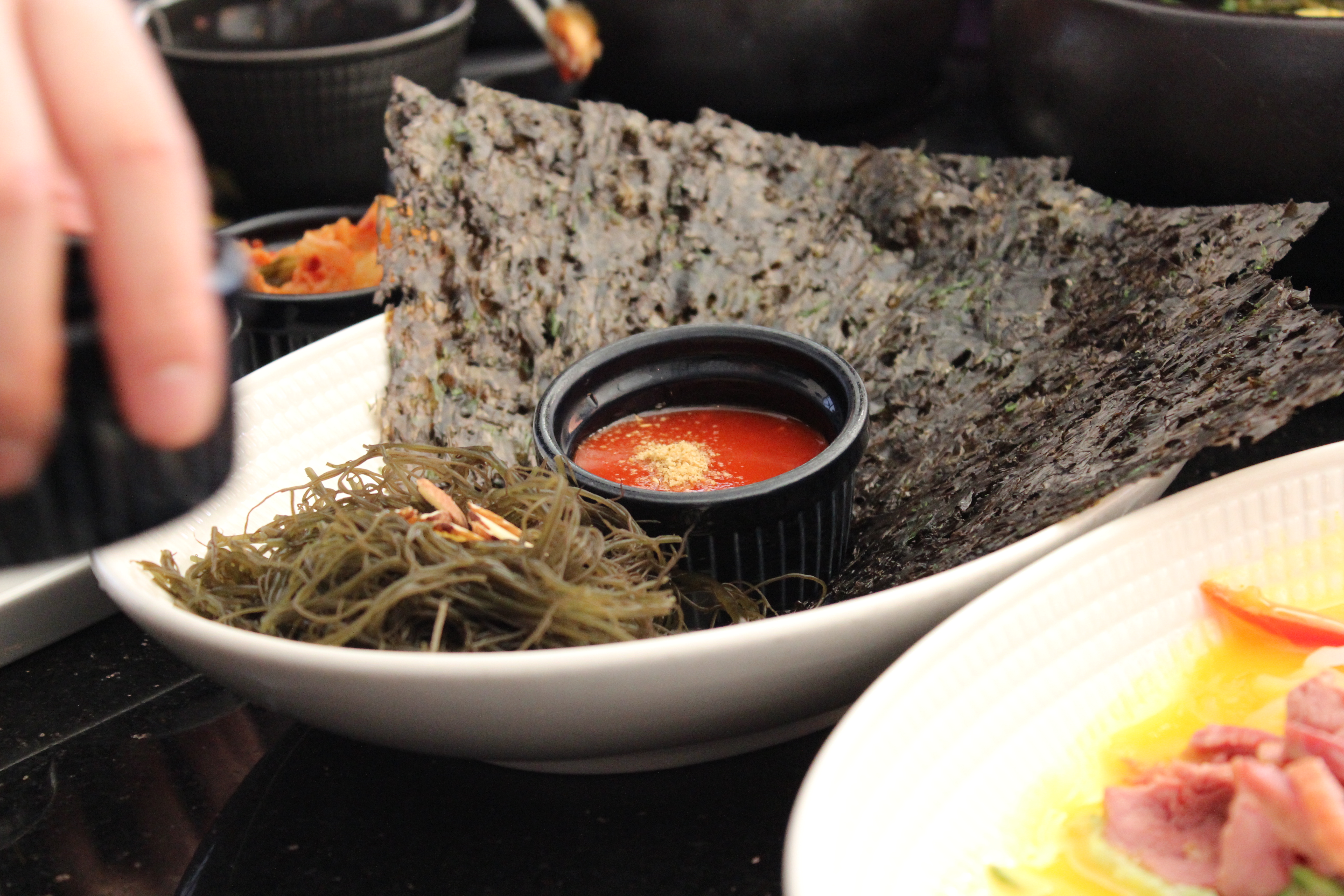 나물을 초장에 조금 찍은 뒤 김에 싸서 먹으면 정말 최고예요.