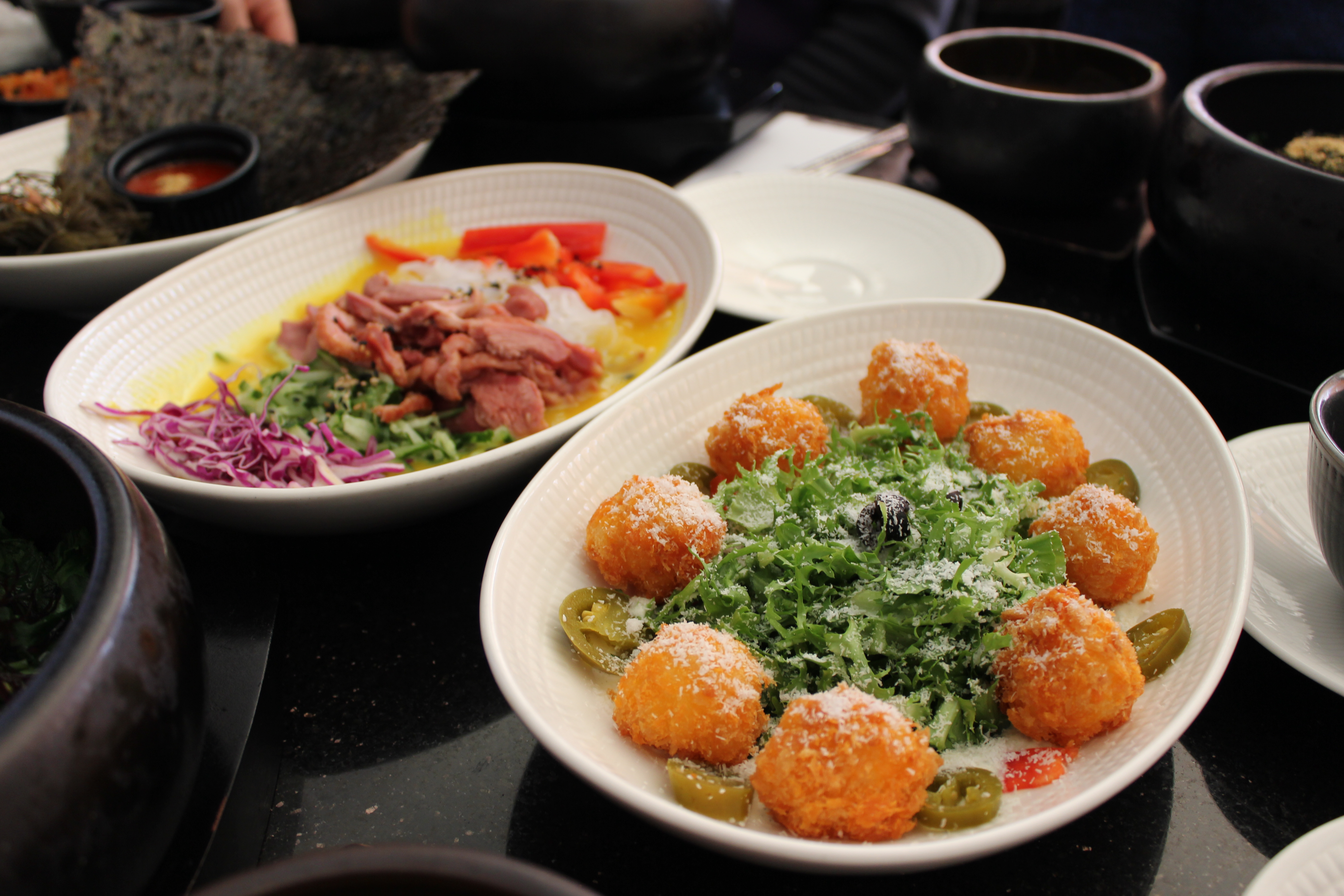 코코넛가루를 입혀 튀긴 새우볼이 올라간 샐러드!